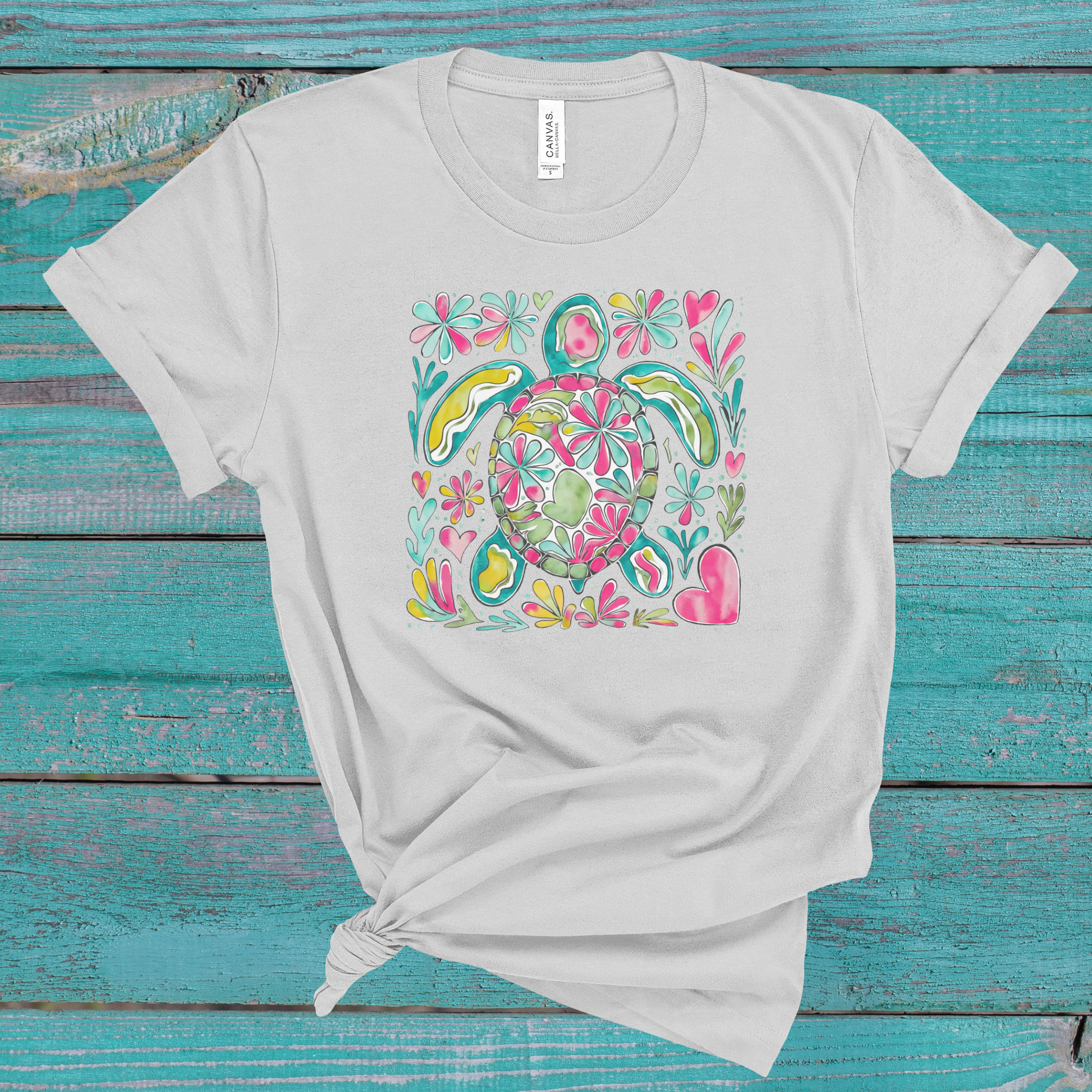 Super soft short-sleeve unisex tee featuring our "Colorful Sea Turtle" design, DTF transfer on a Bella + Canvas 3001CVC in Athletic Heather. Lightweight, comfy, and made to wear on repeat.