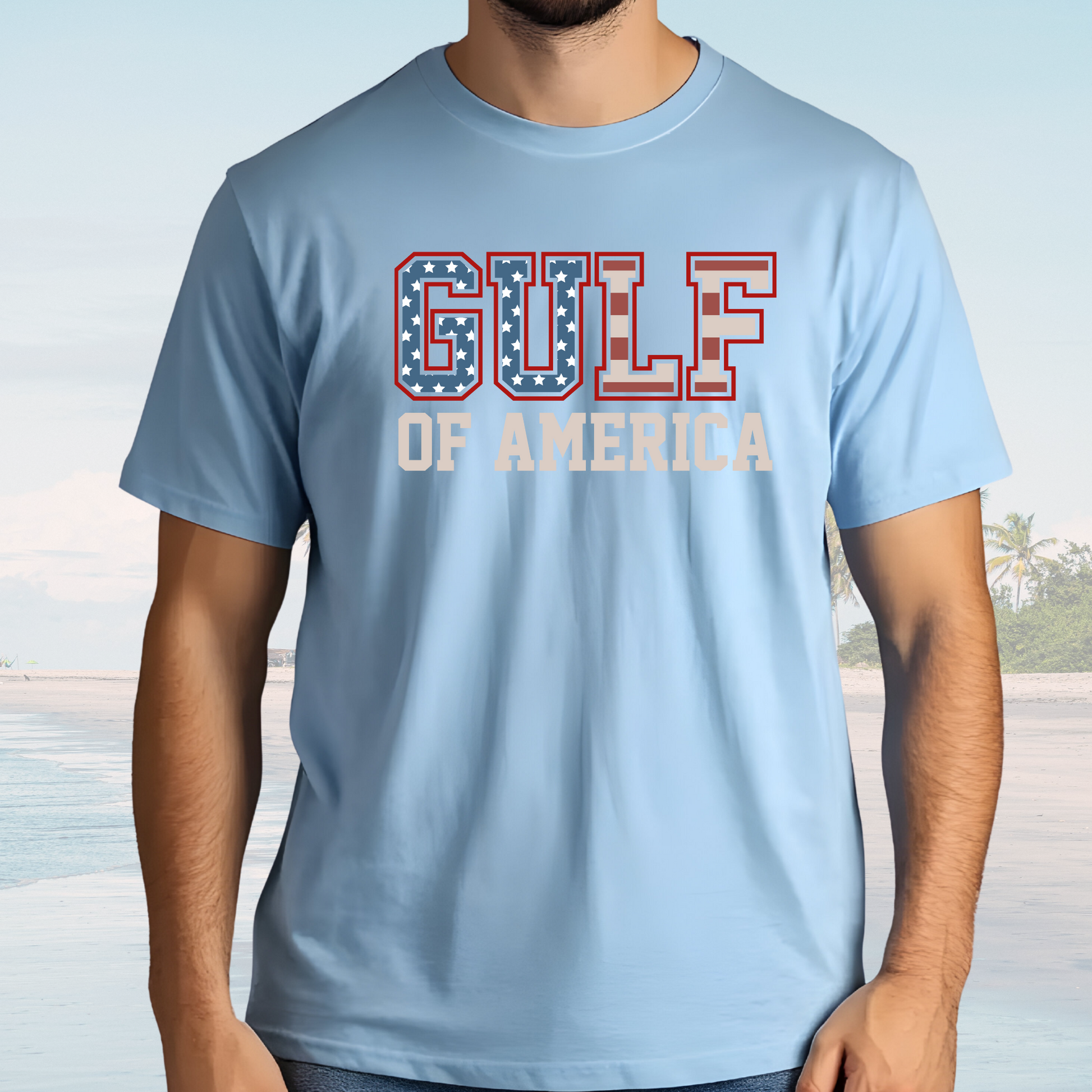 Super soft short-sleeve unisex tee featuring our "Gulf of America" design, DTF transfer on a Hanes 4980 Perfect-T in light blue. Lightweight, comfy, and made to wear on repeat.