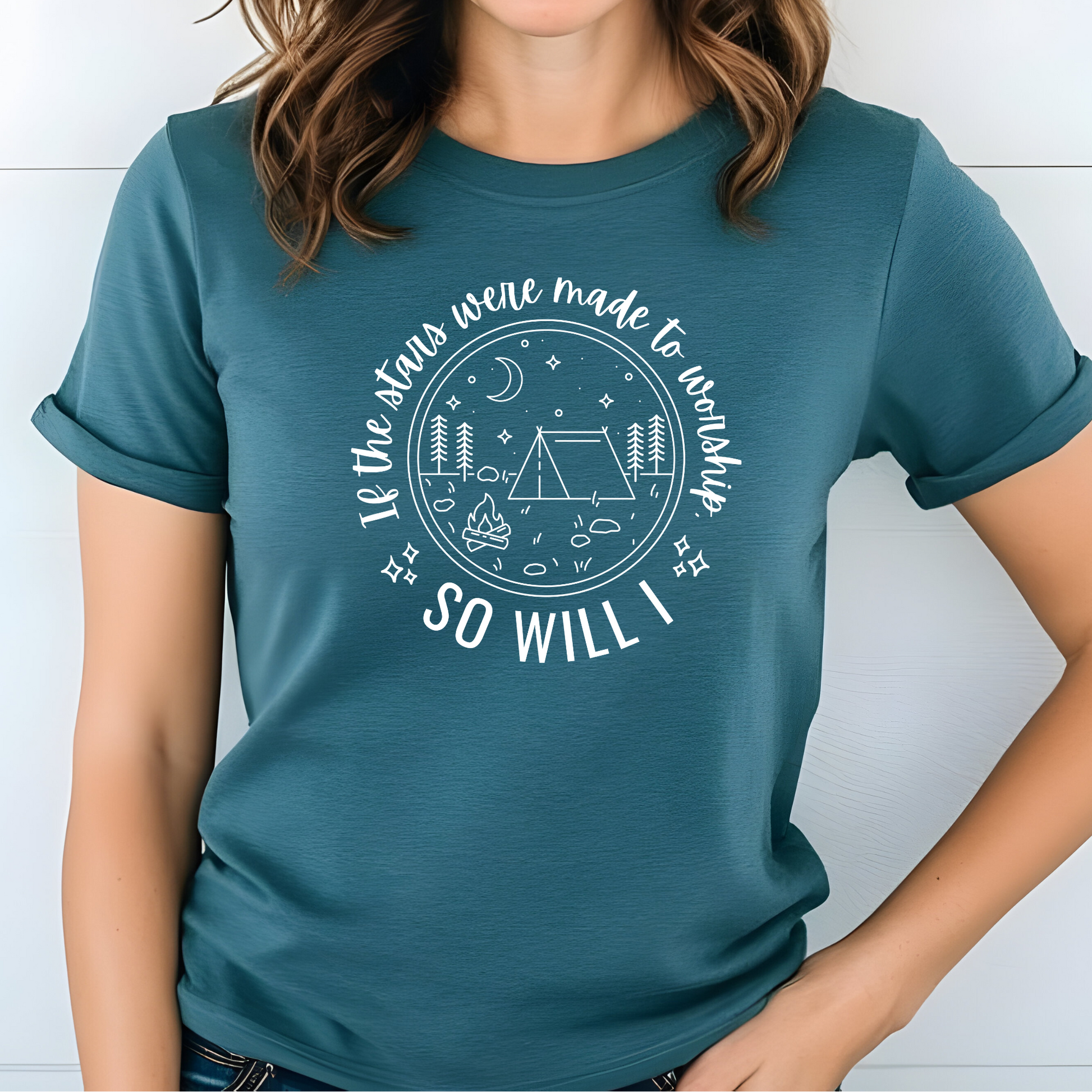 Super soft short-sleeve unisex tee featuring our "Stars were made to Worship" design, DTF transfer on a Bella + Canvas 3001CVC in Heather Deep Teal tee. Lightweight, comfy, and made to wear on repeat.