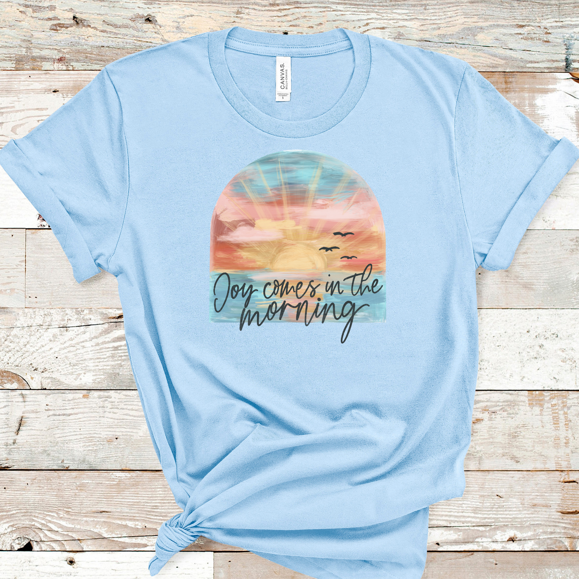 Super soft short-sleeve unisex tee featuring our "Joy Comes in the Morning" design, DTF transfer on a on a Bella + Canvas 3001CVC in heather baby blue tee. Lightweight, comfy, and made to wear on repeat.