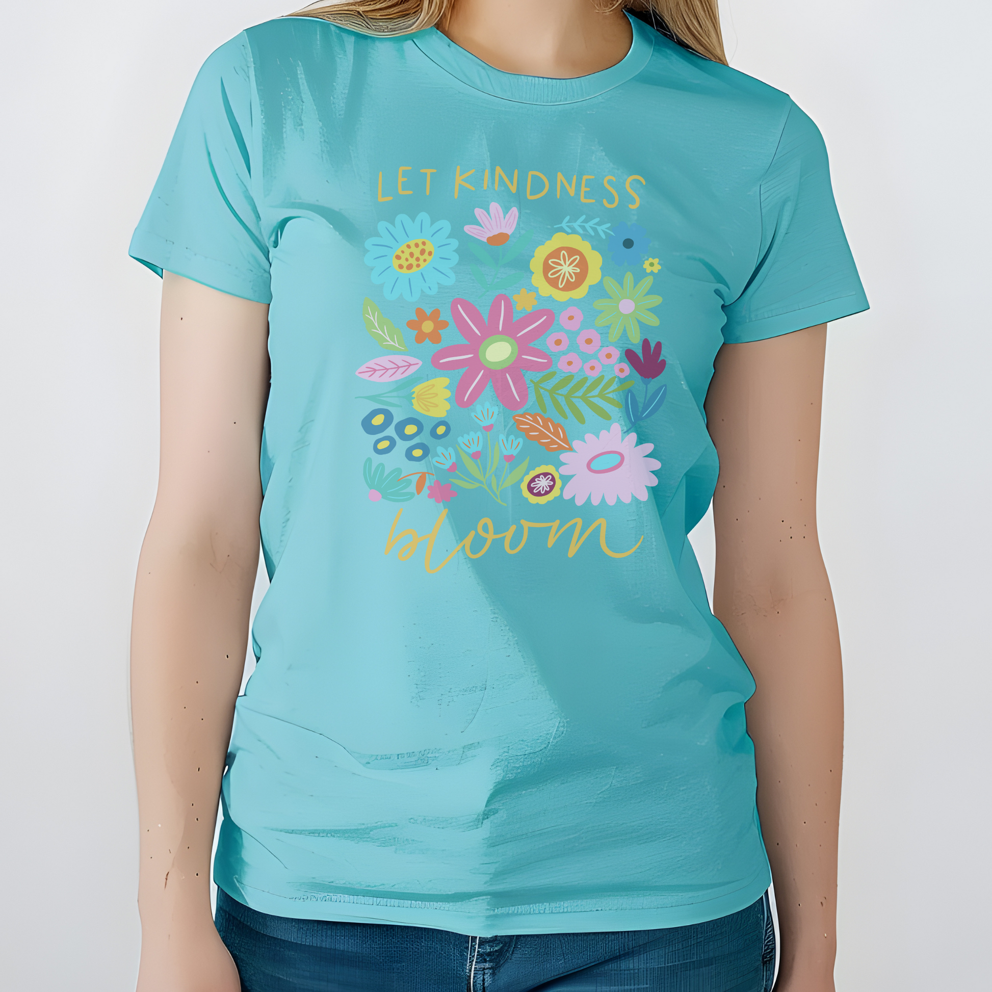 Super soft short-sleeve unisex tee featuring our "Let Kindness Bloom" design, DTF transfer on a Bella + Canvas 3001CVC in Heather Aqua Blue tee. Lightweight, comfy, and made to wear on repeat.
