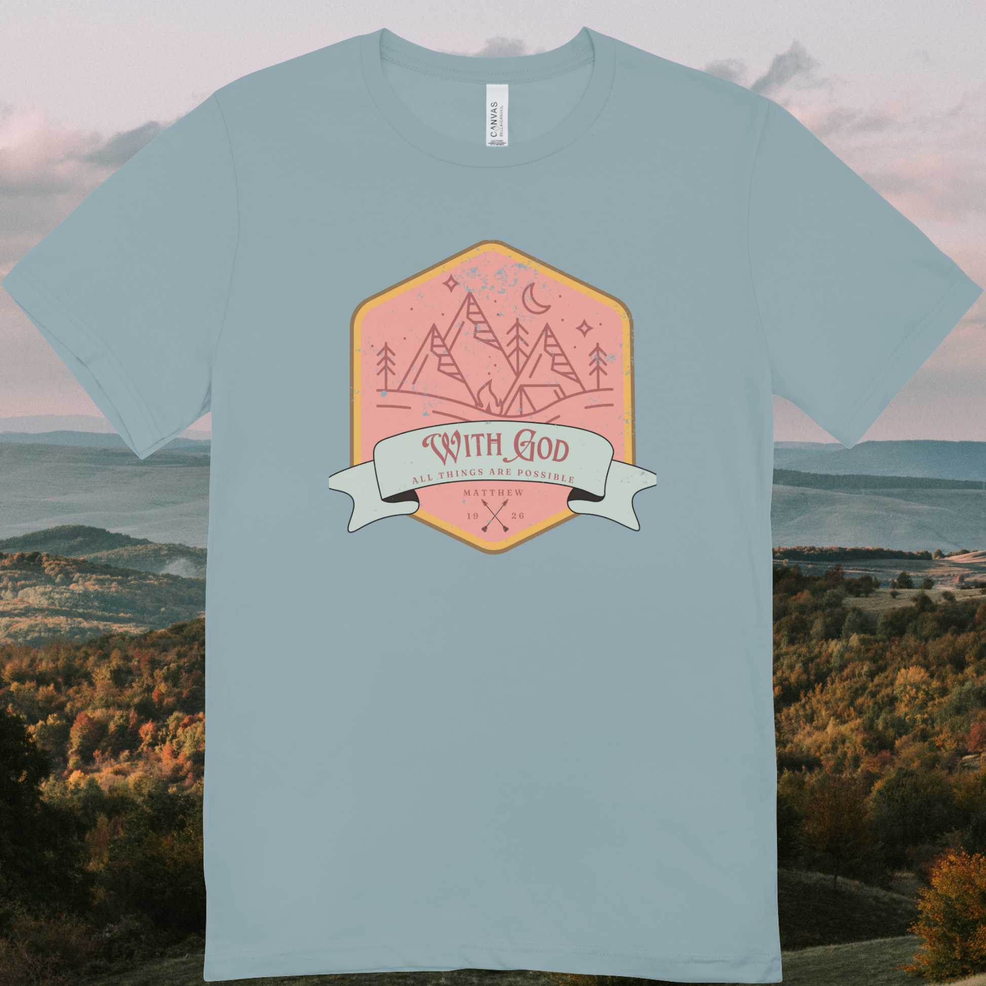 Super soft short sleeve unisex tee featuring our "Matthew 19:26 With God All Things Are Possible" design, sublimated on a Bella + Canvas 3001CVC in blue lagoon. Lightweight, comfy, and made to wear on repeat.