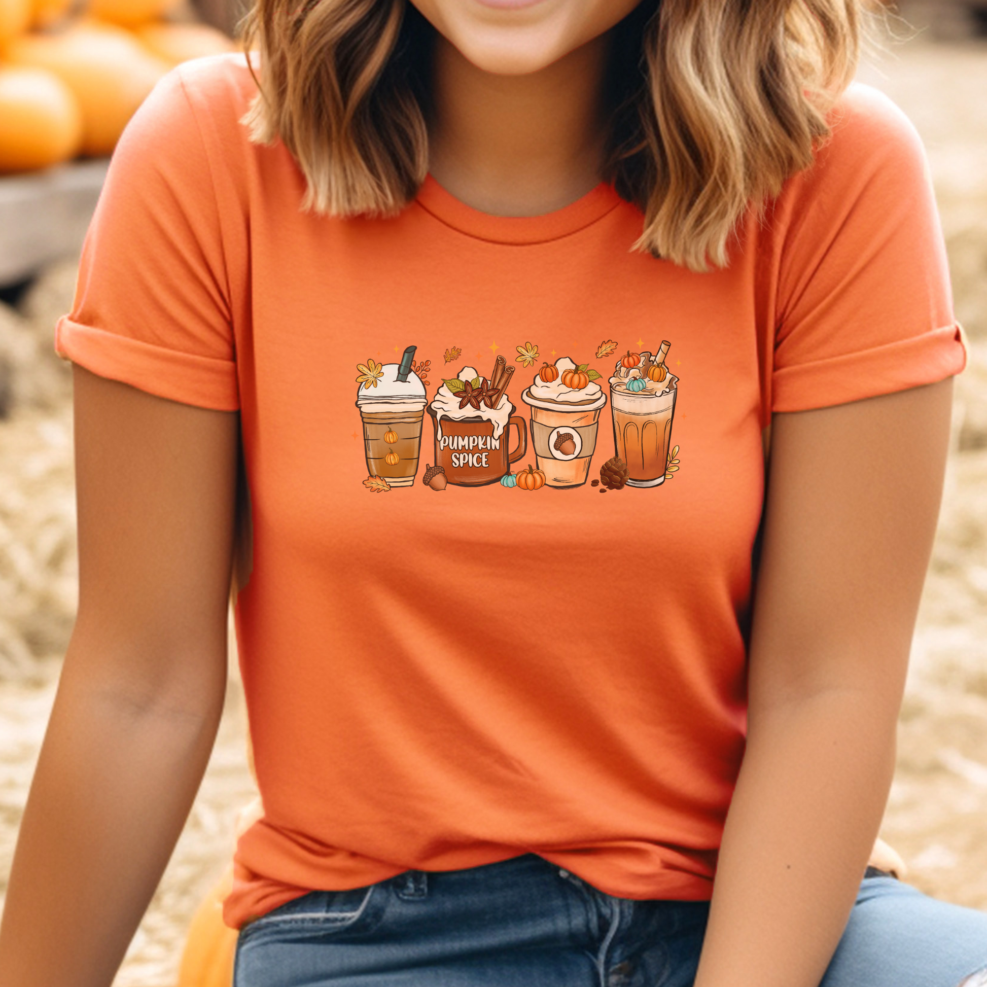 Super soft short-sleeve unisex tee featuring our "Pumpkin Spice" design, DTF transfer on a Bella + Canvas 3001CVC in Heather Orange tee. Lightweight, comfy, and made to wear on repeat.